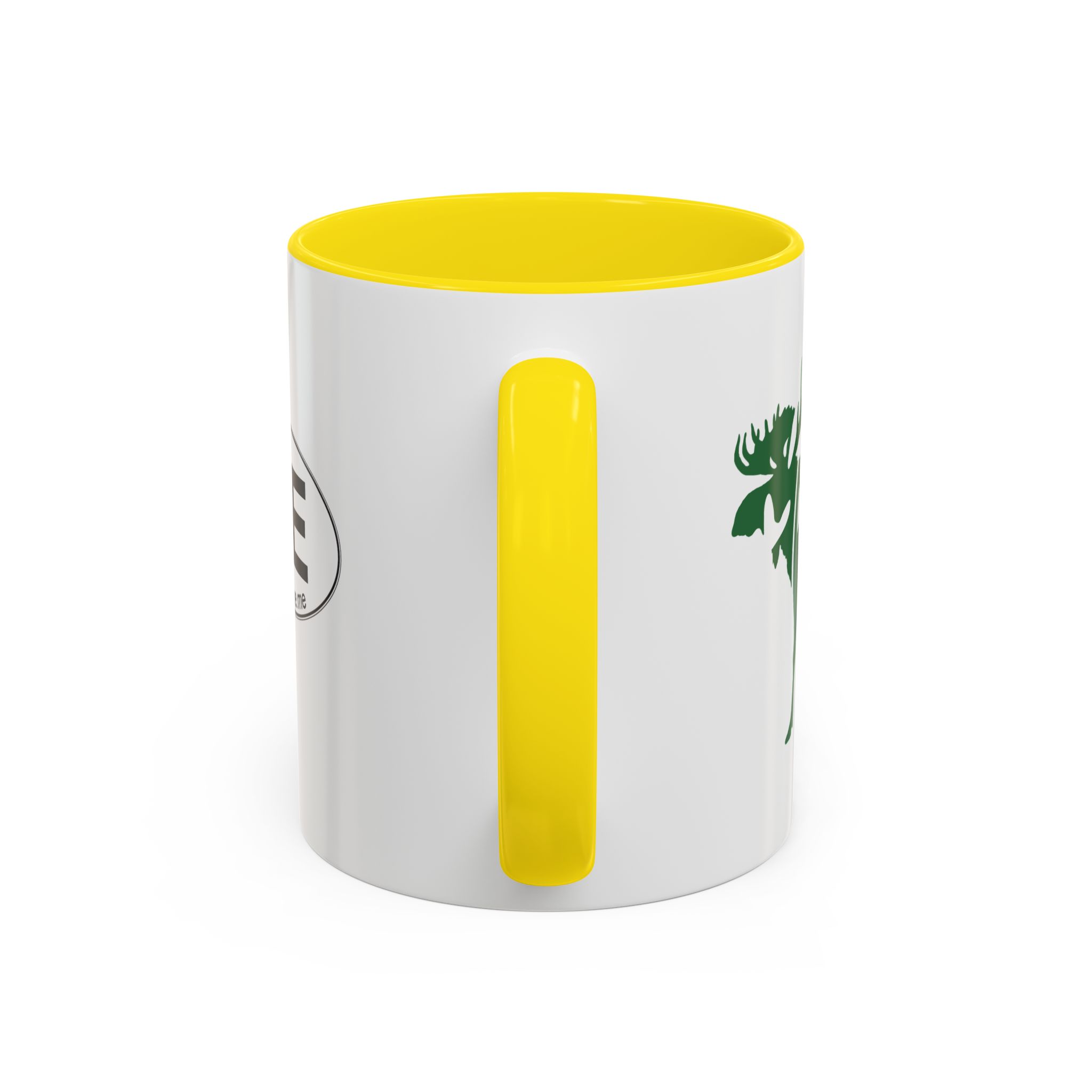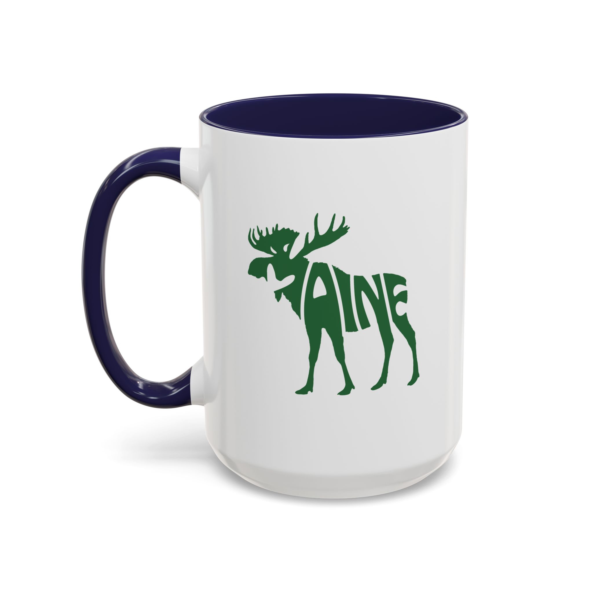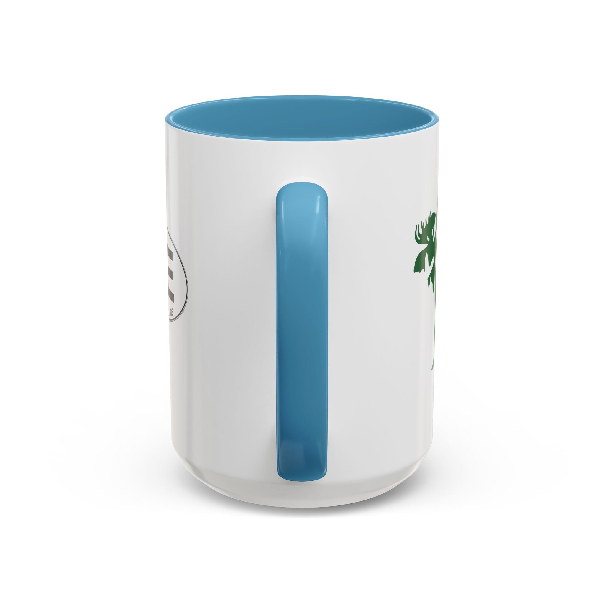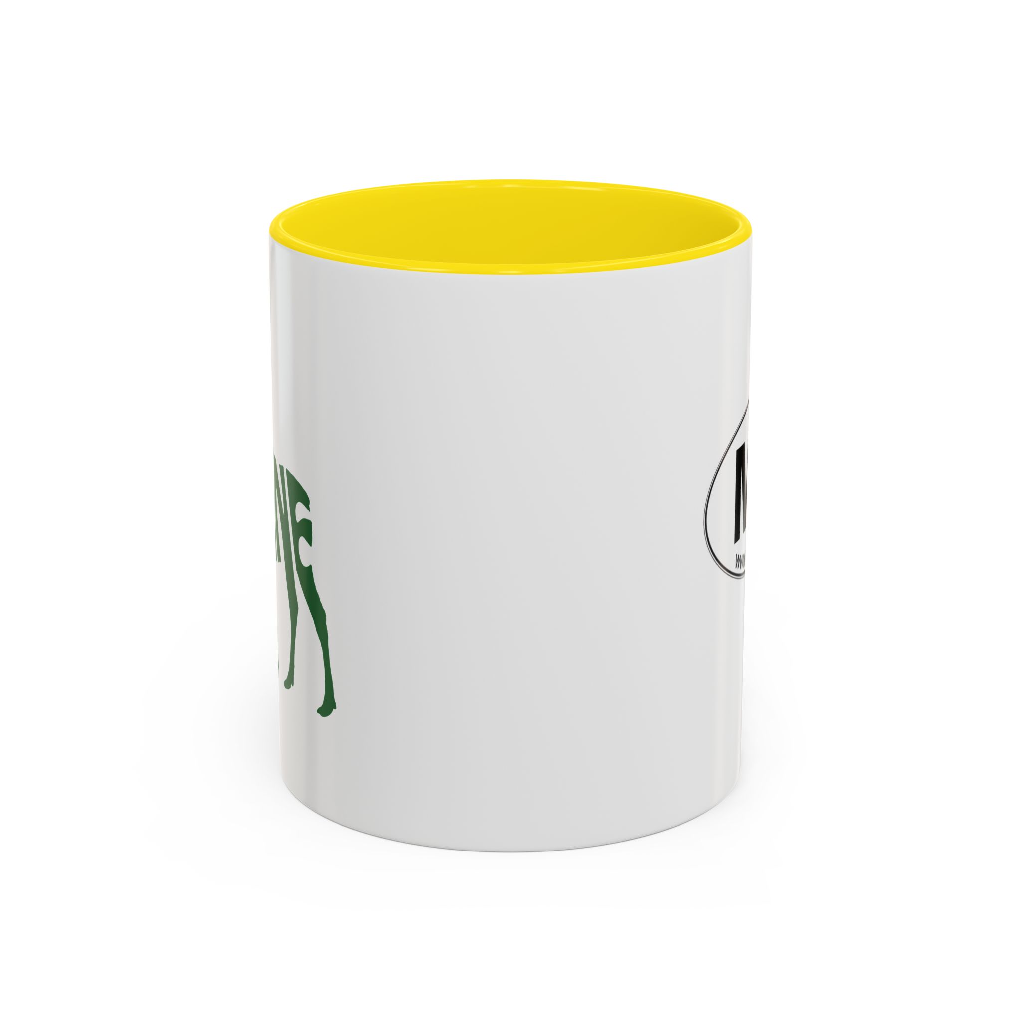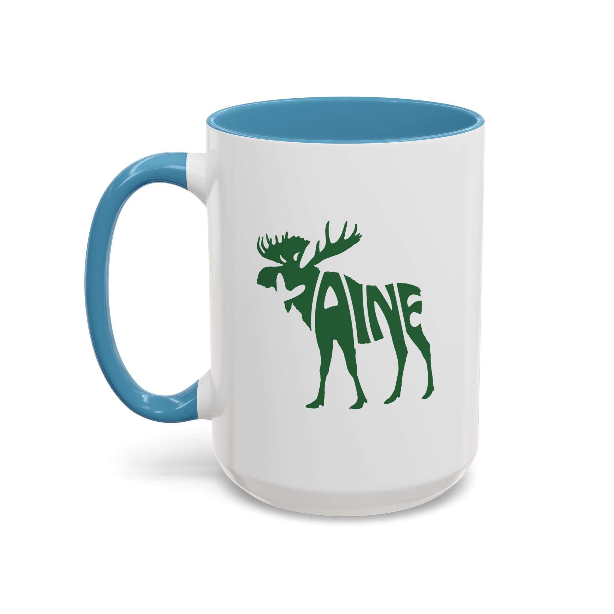 Maine Green Moose accented ceramic mug. This mug brings the perfect blend of style and functionality to elevate your coffee or tea ritual. Available in two generous sizes, 11oz (0.33 l) and 15oz (0.44 l), this mug offers ample space for your favorite brew. Made with white ceramic and sporting a sleek glossy finish with eye-catching contrast, this mug is a bliss both to use and to look at. The ergonomic C-shaped handle provides a comfortable grip, while the lead and BPA-free construction guarantee peace of mind with every sip.