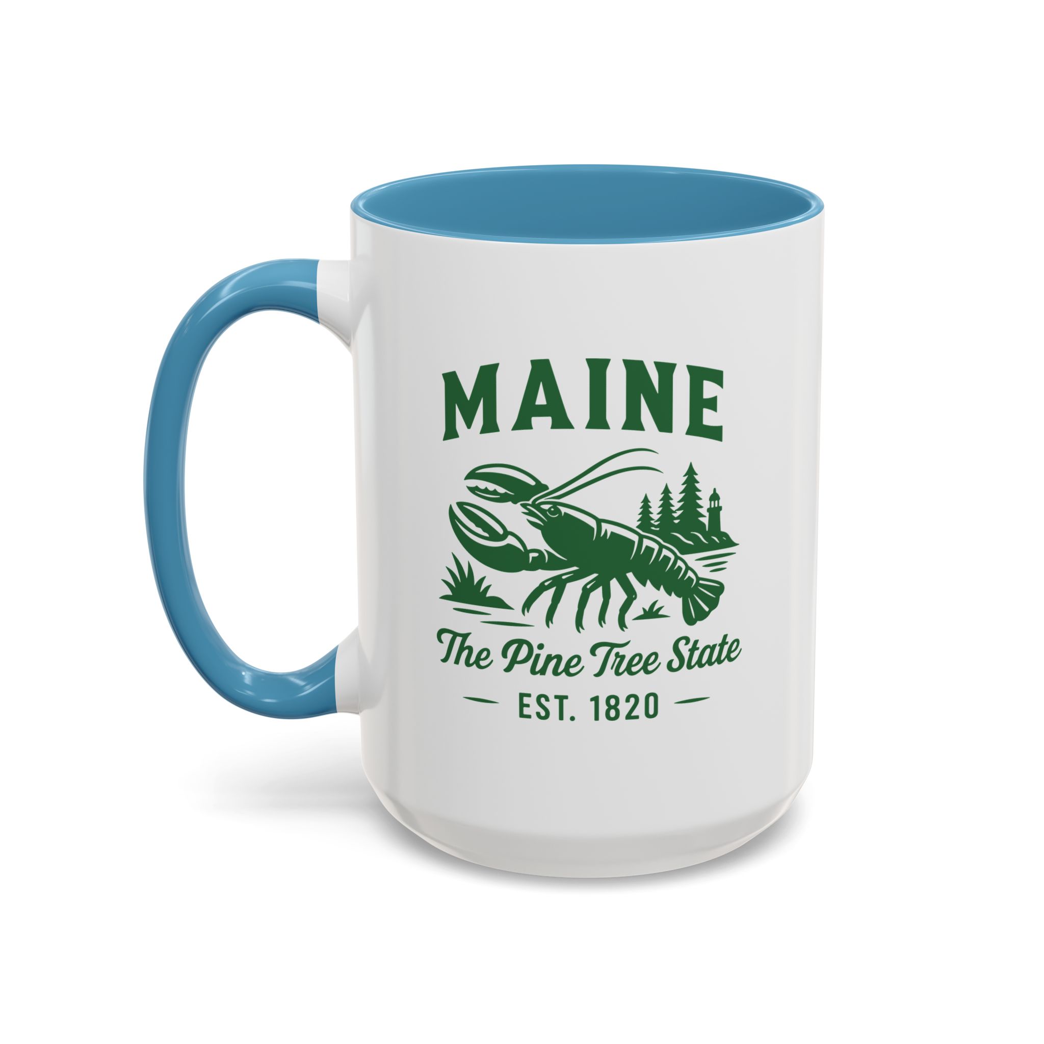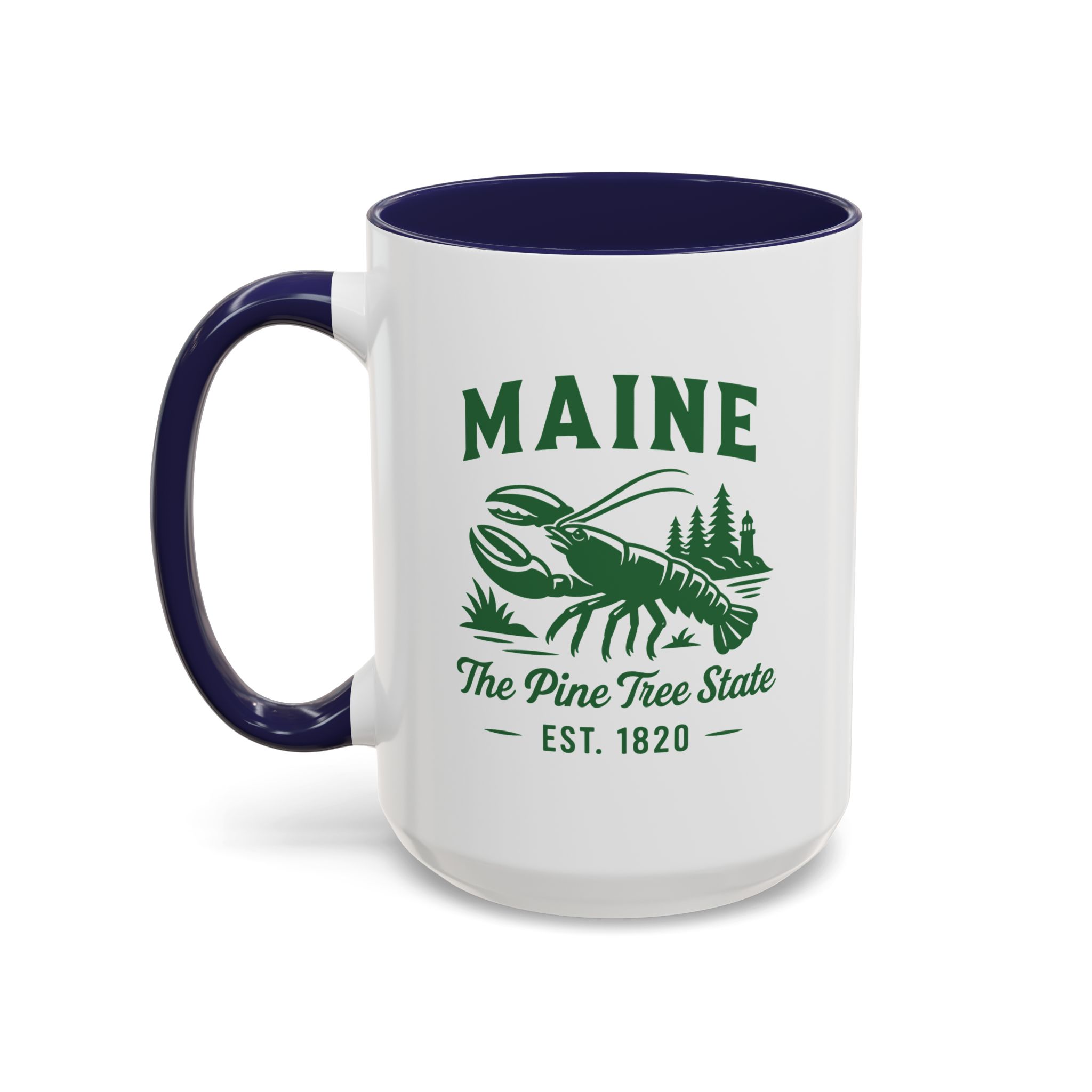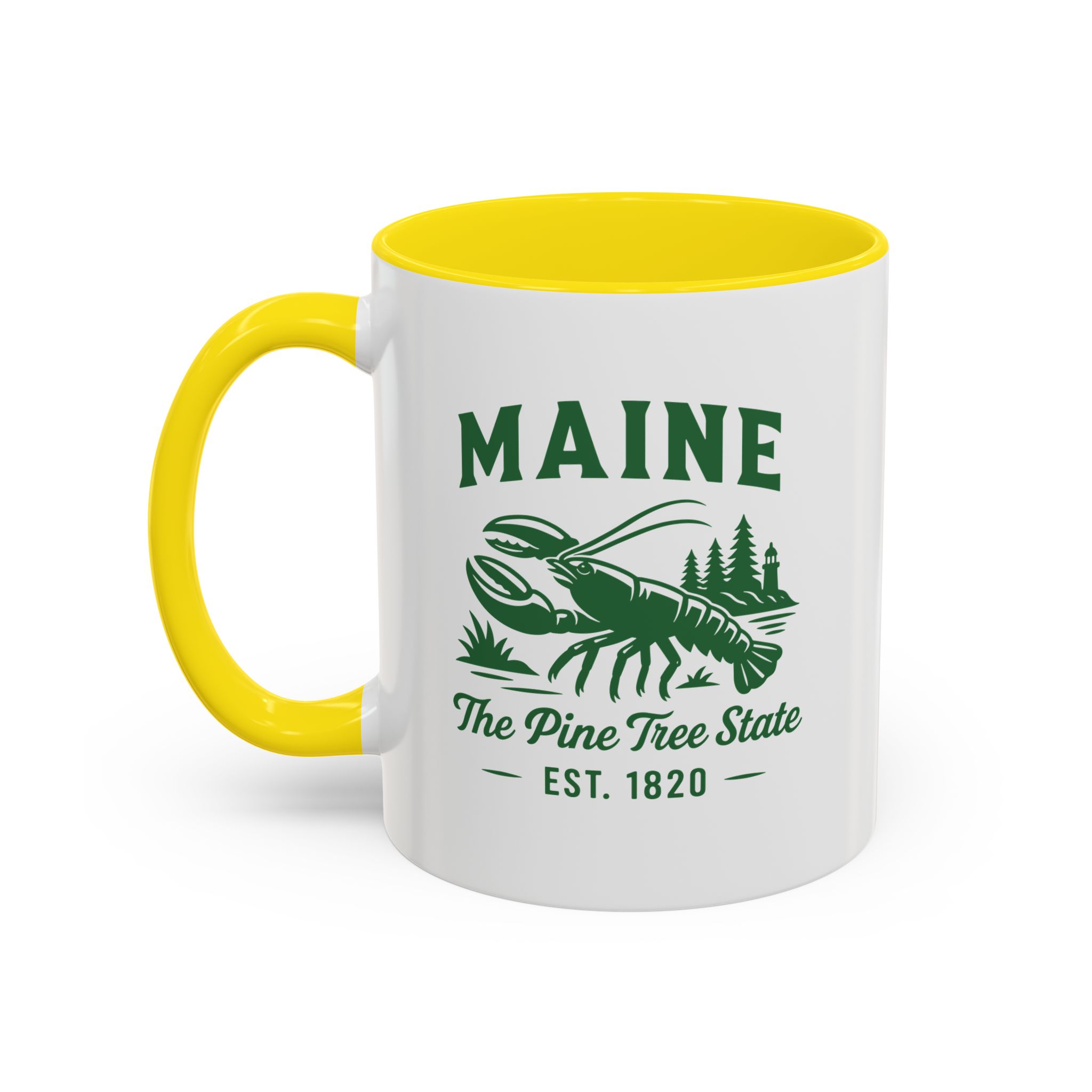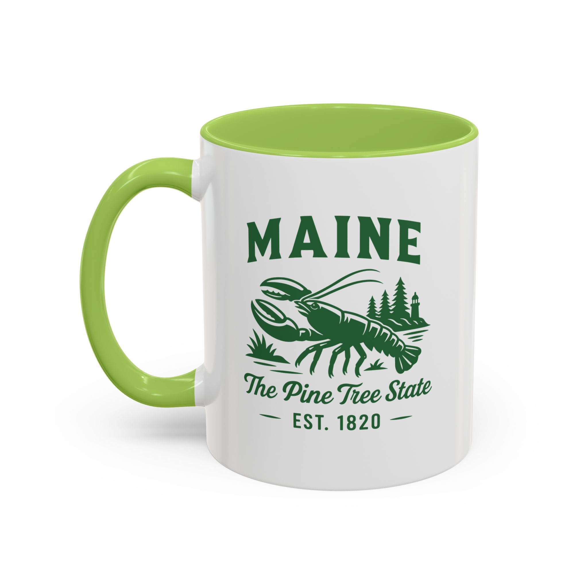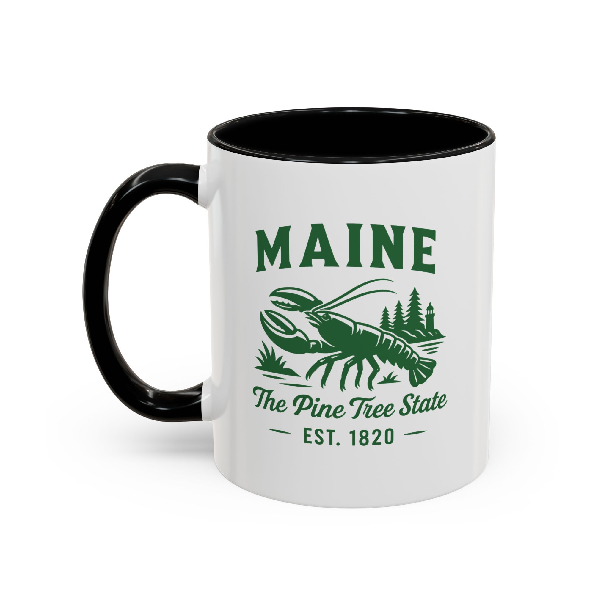 Maine Lobster Est. 1820 Green Print accented ceramic mug with the well known Bumper Sticker Design on opposite Side. This mug brings the perfect blend of style and functionality to elevate your coffee or tea ritual. Available in two generous sizes, 11oz (0.33 l) and 15oz (0.44 l), this mug offers ample space for your favorite brew. Made with white ceramic and sporting a sleek glossy finish with eye-catching contrast, this mug is a bliss both to use and to look at. The ergonomic C-shaped handle provides a comfortable grip, while the lead and BPA-free construction guarantee peace of mind with every sip.