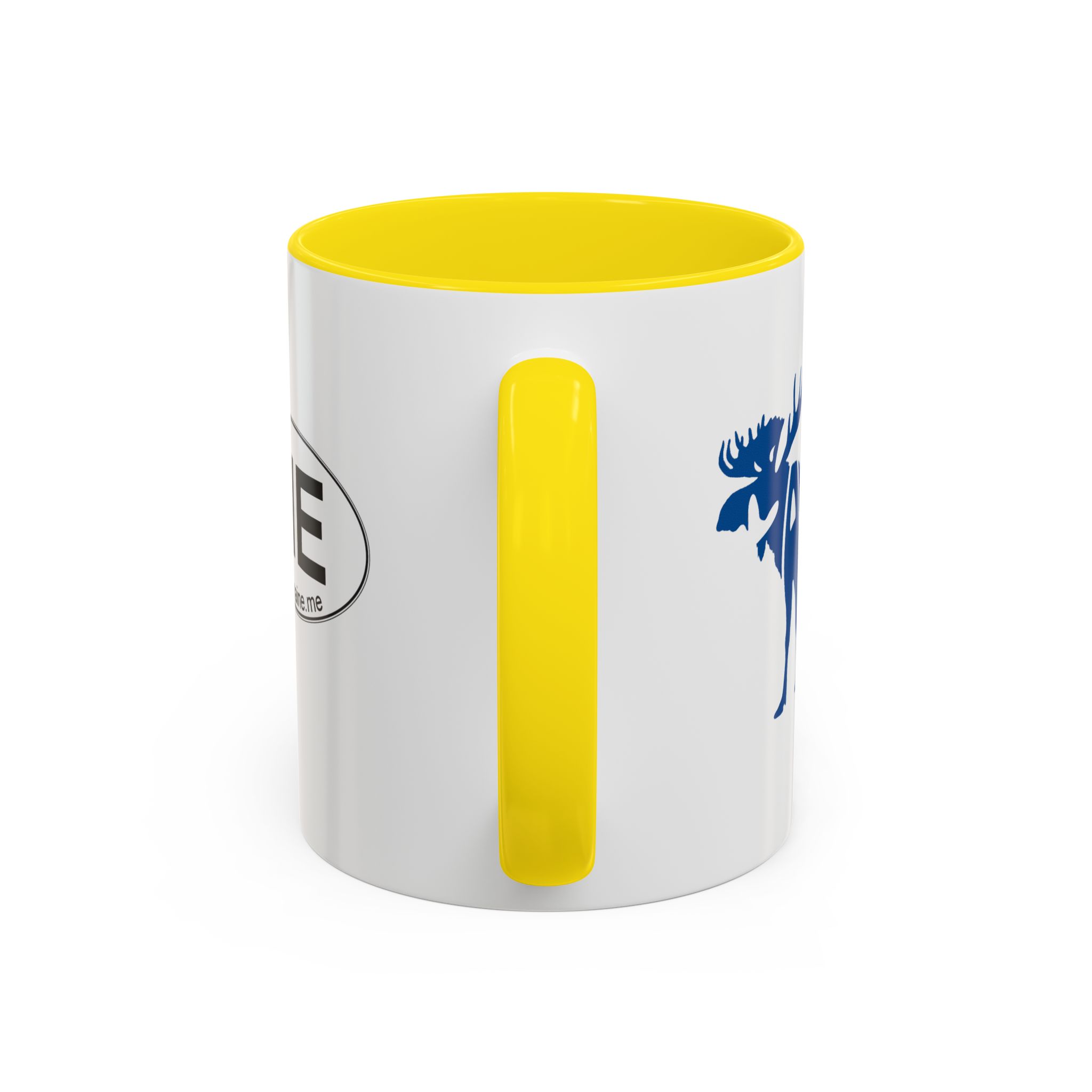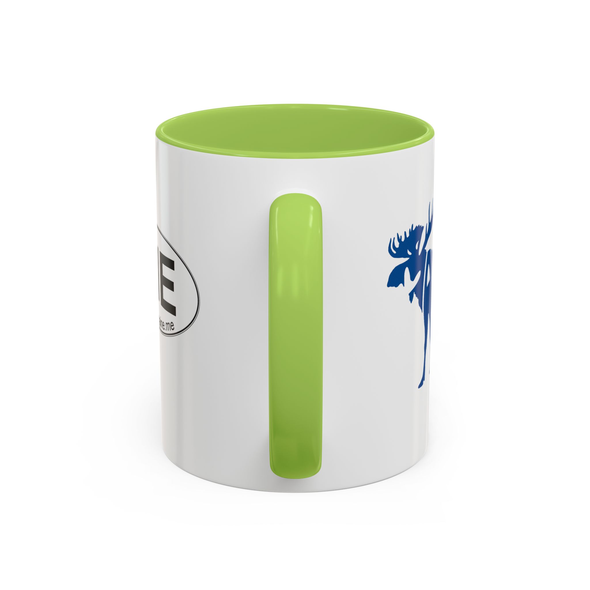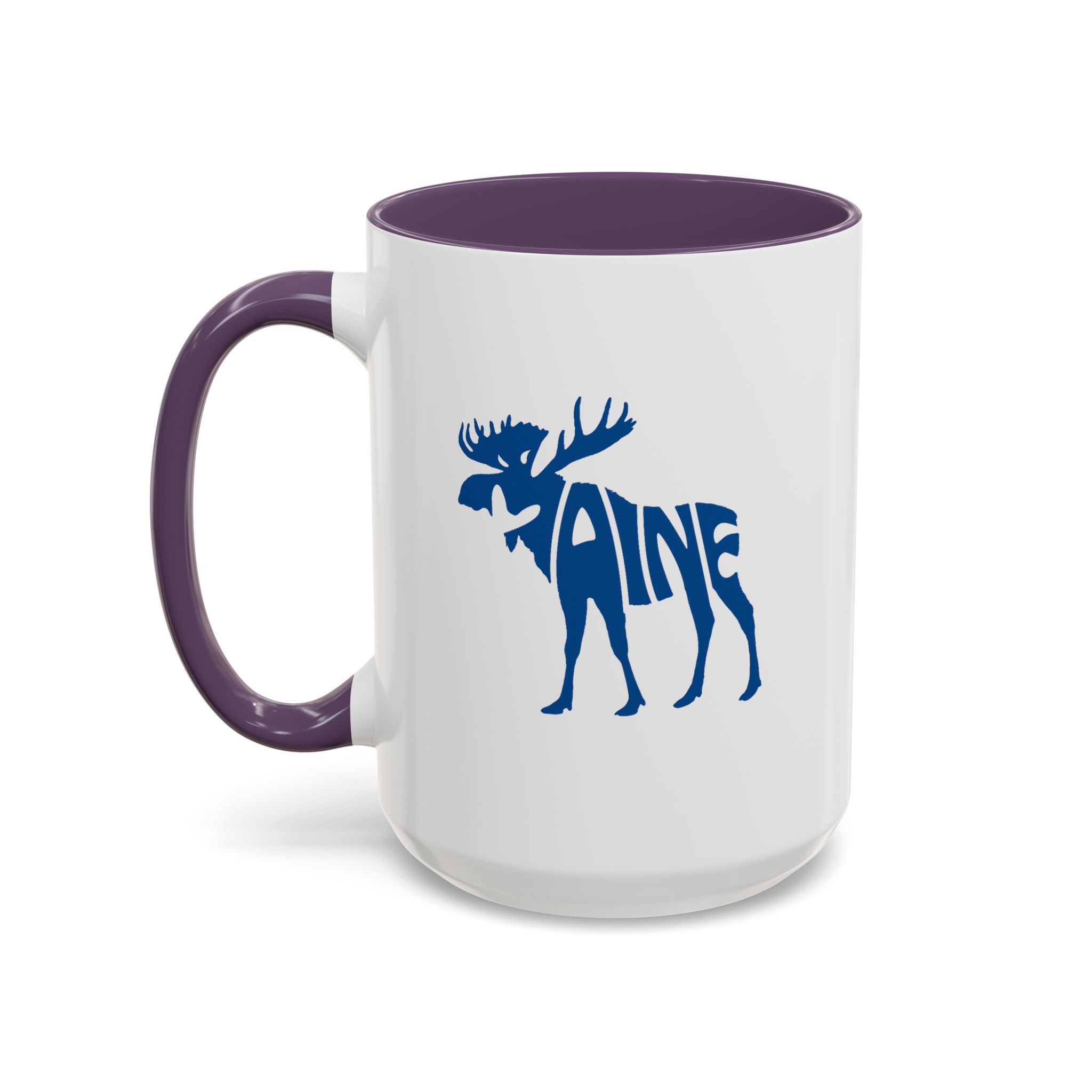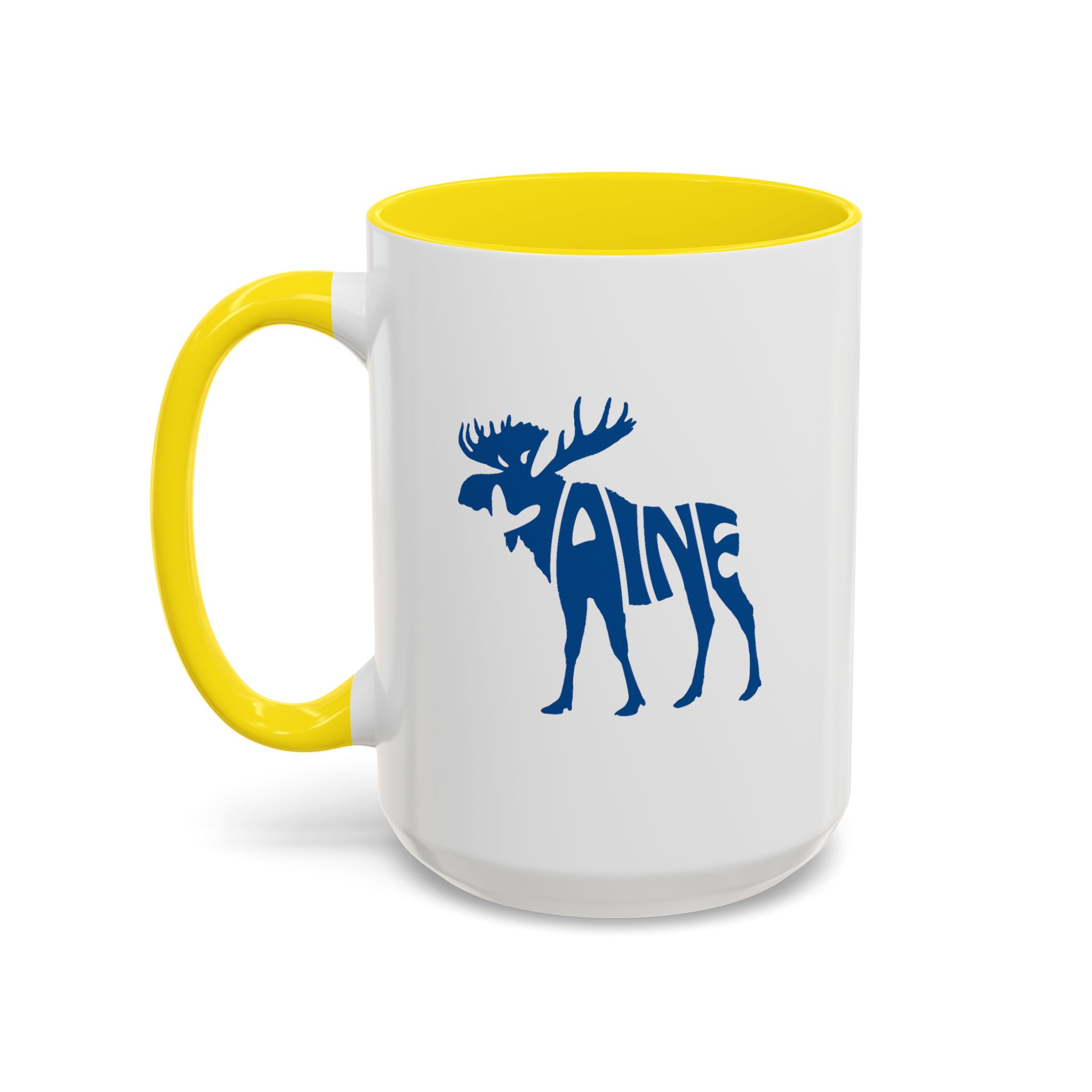 Maine.ME Blue Moose accented ceramic mug. This mug brings the perfect blend of style and functionality to elevate your coffee or tea ritual. Available in two generous sizes, 11oz (0.33 l) and 15oz (0.44 l), this mug offers ample space for your favorite brew. Made with white ceramic and sporting a sleek glossy finish with eye-catching contrast, this mug is a bliss both to use and to look at. The ergonomic C-shaped handle provides a comfortable grip, while the lead and BPA-free construction guarantee peace of mind with every sip.