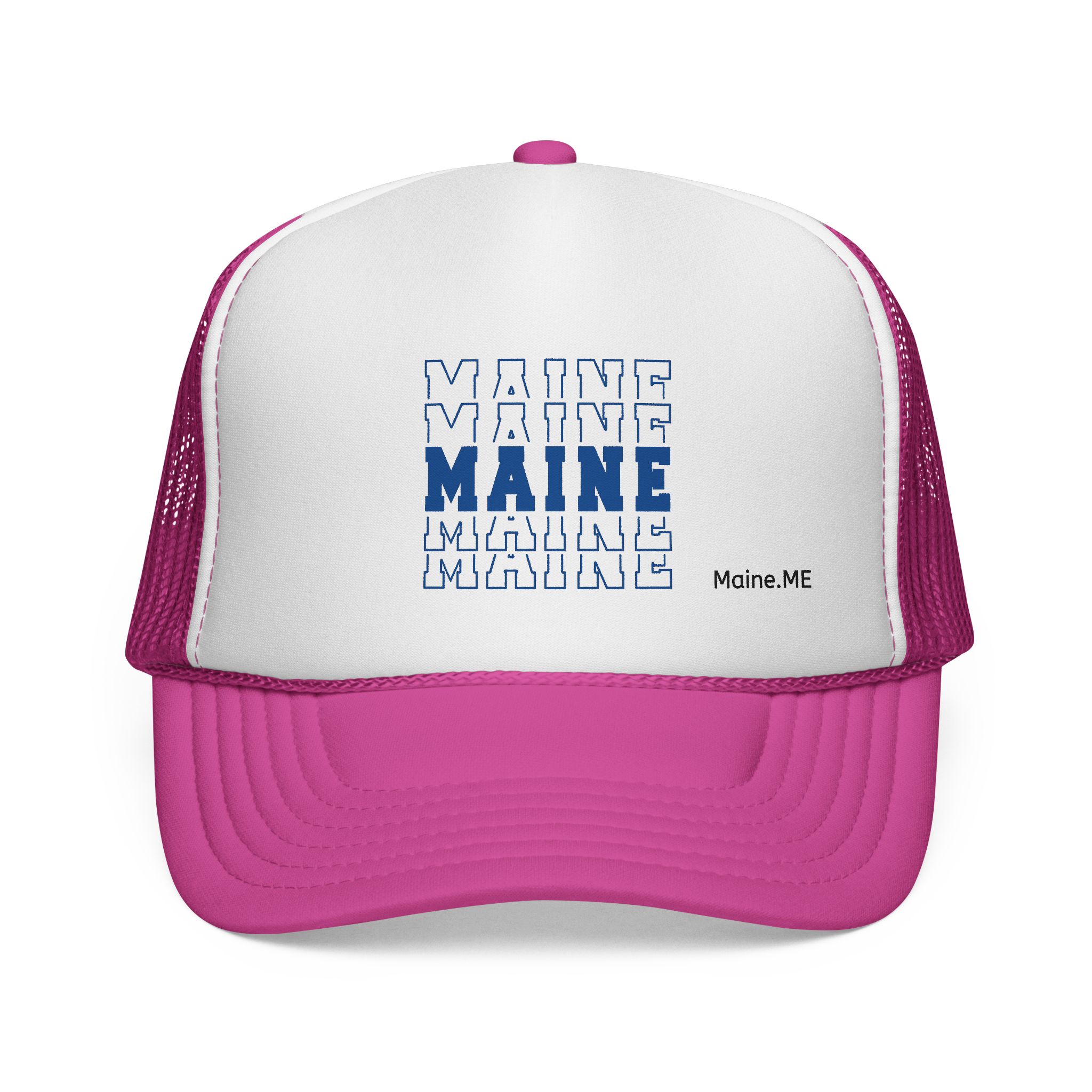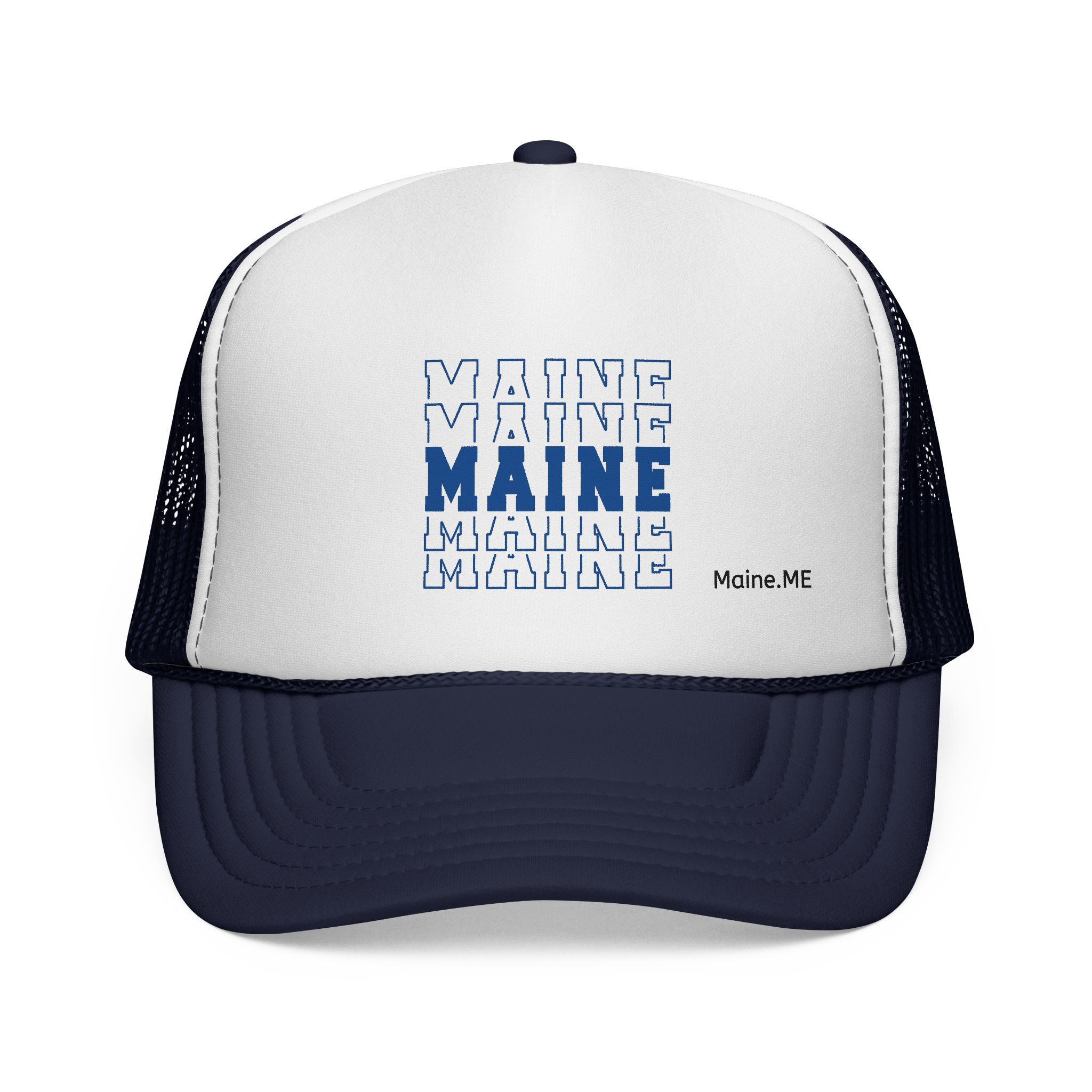 Stacked MAINE Blue Words Trucker caps are versatile and fit almost any occasion. A 100% polyester front and 100% nylon mesh weave back make these hats super durable through regular wear and tear. They come in one size with an adjustable plastic snap closure: 22.8″ (58cm). The cap’s front has six rows of visor stitching. Pick any (or all) of the color variations and start customizing them with your original designs.