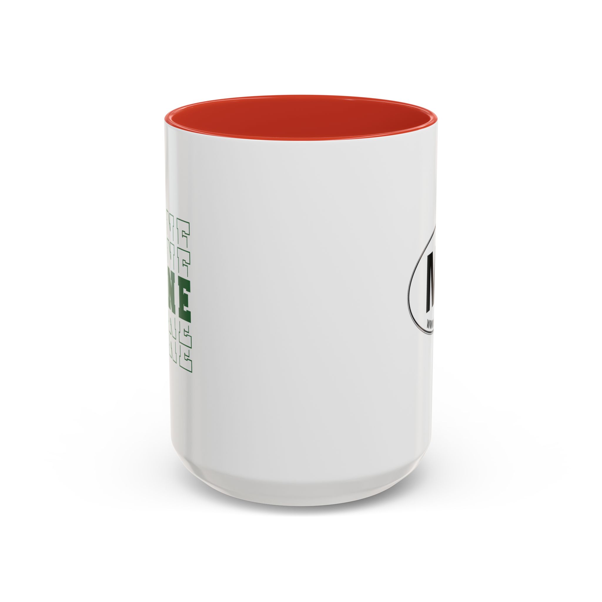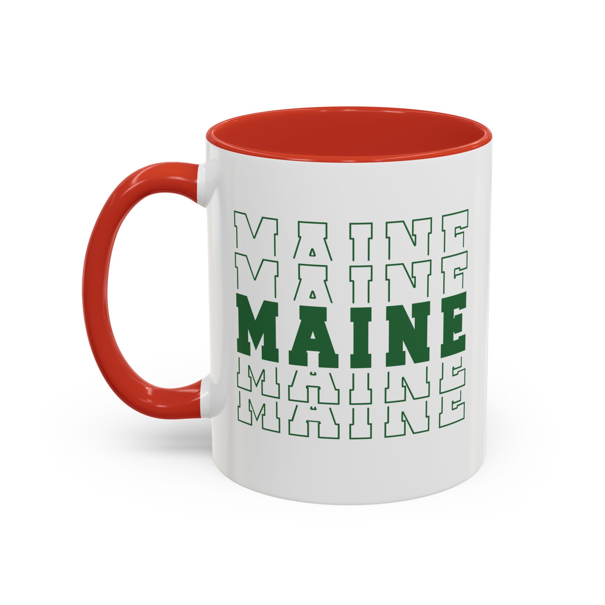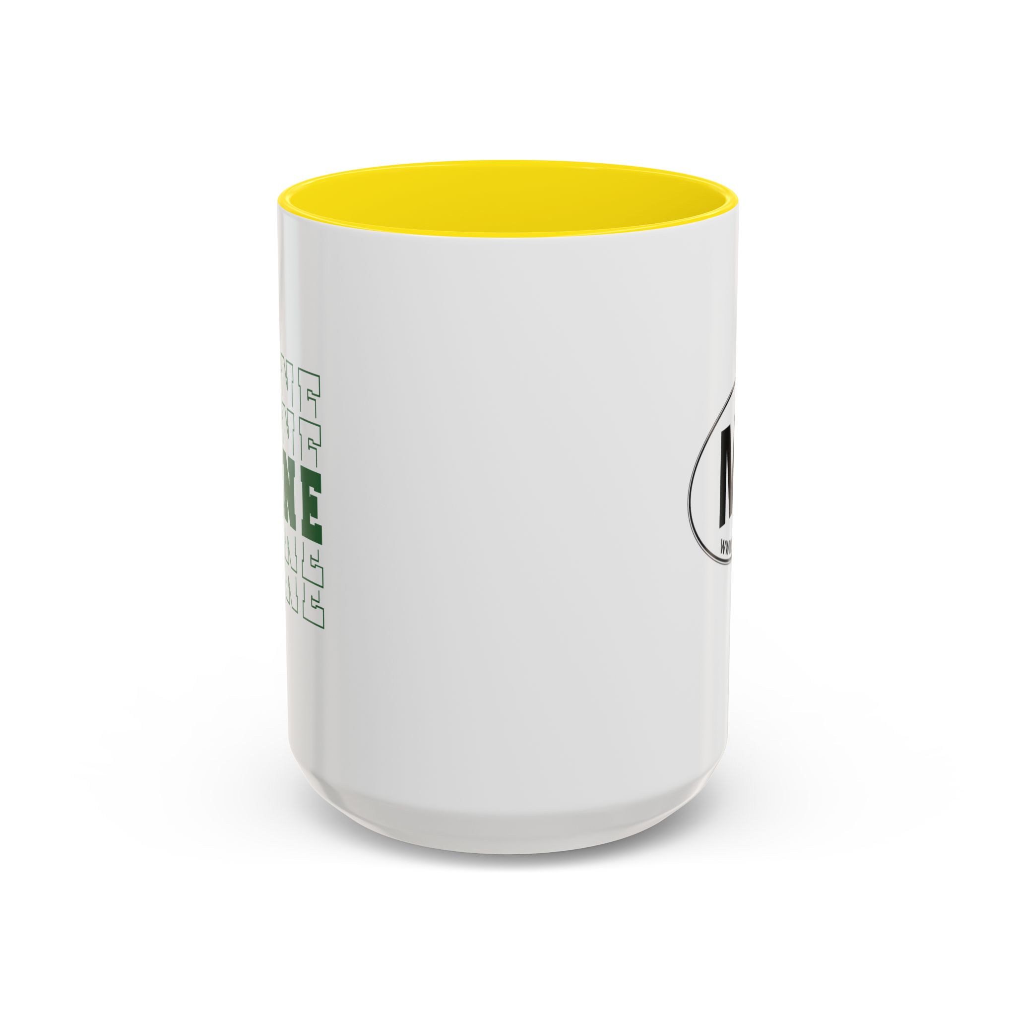 Stacked MAINE Green Words accented ceramic mug. This mug brings the perfect blend of style and functionality to elevate your coffee or tea ritual. Available in two generous sizes, 11oz (0.33 l) and 15oz (0.44 l), this mug offers ample space for your favorite brew. Made with white ceramic and sporting a sleek glossy finish with eye-catching contrast, this mug is a bliss both to use and to look at. The ergonomic C-shaped handle provides a comfortable grip, while the lead and BPA-free construction guarantee peace of mind with every sip.