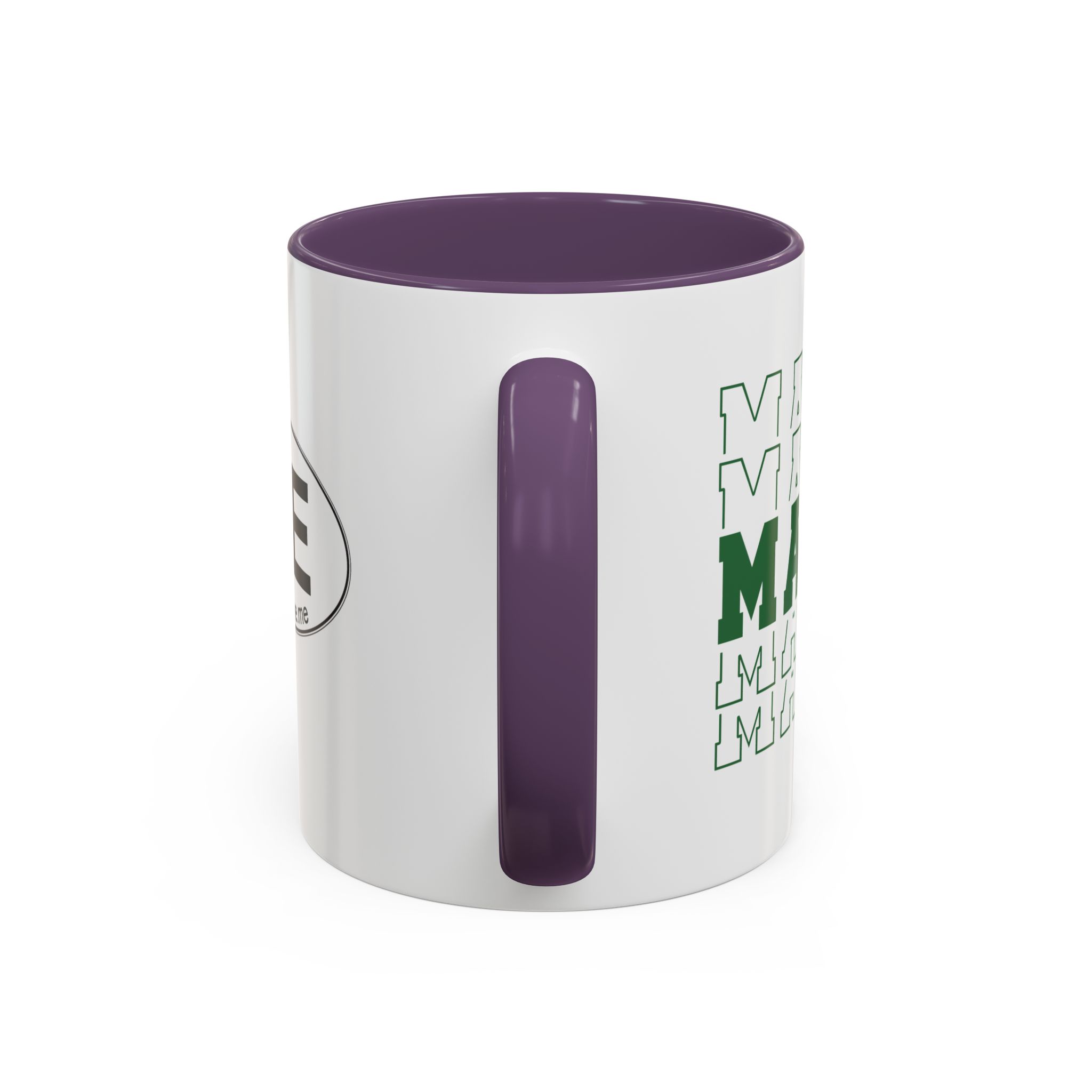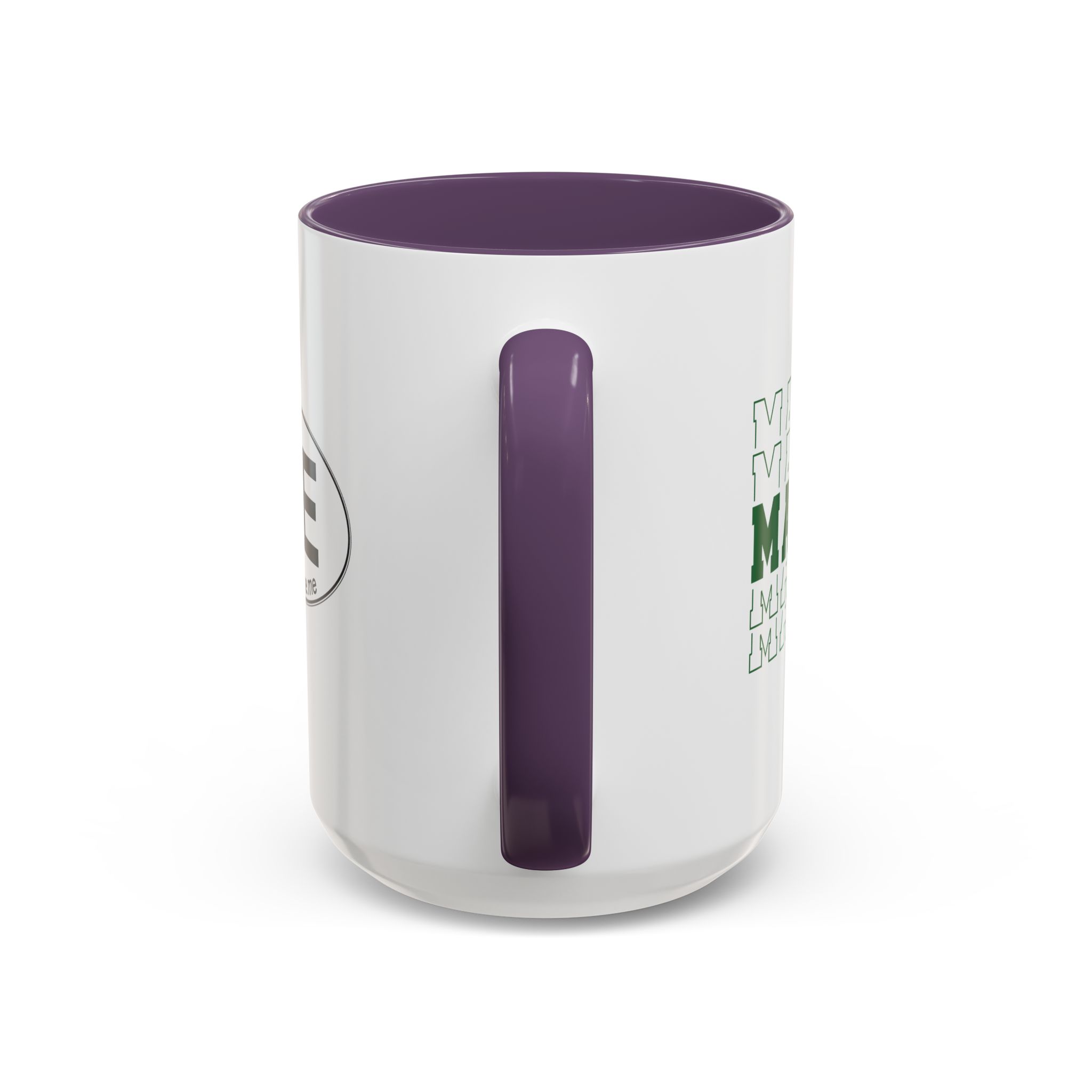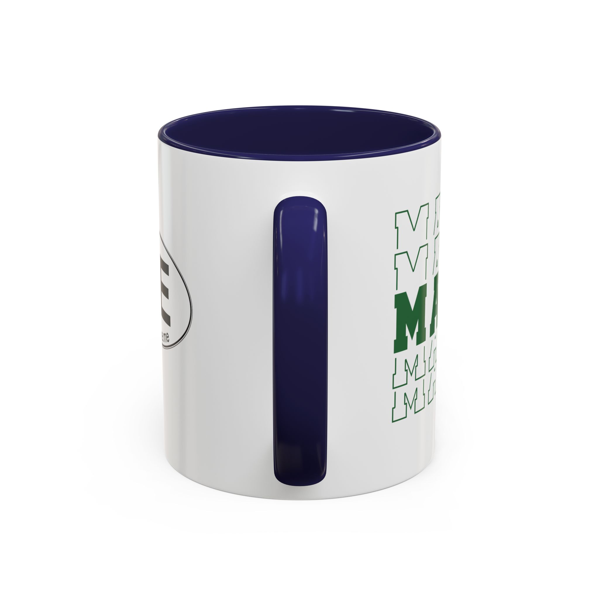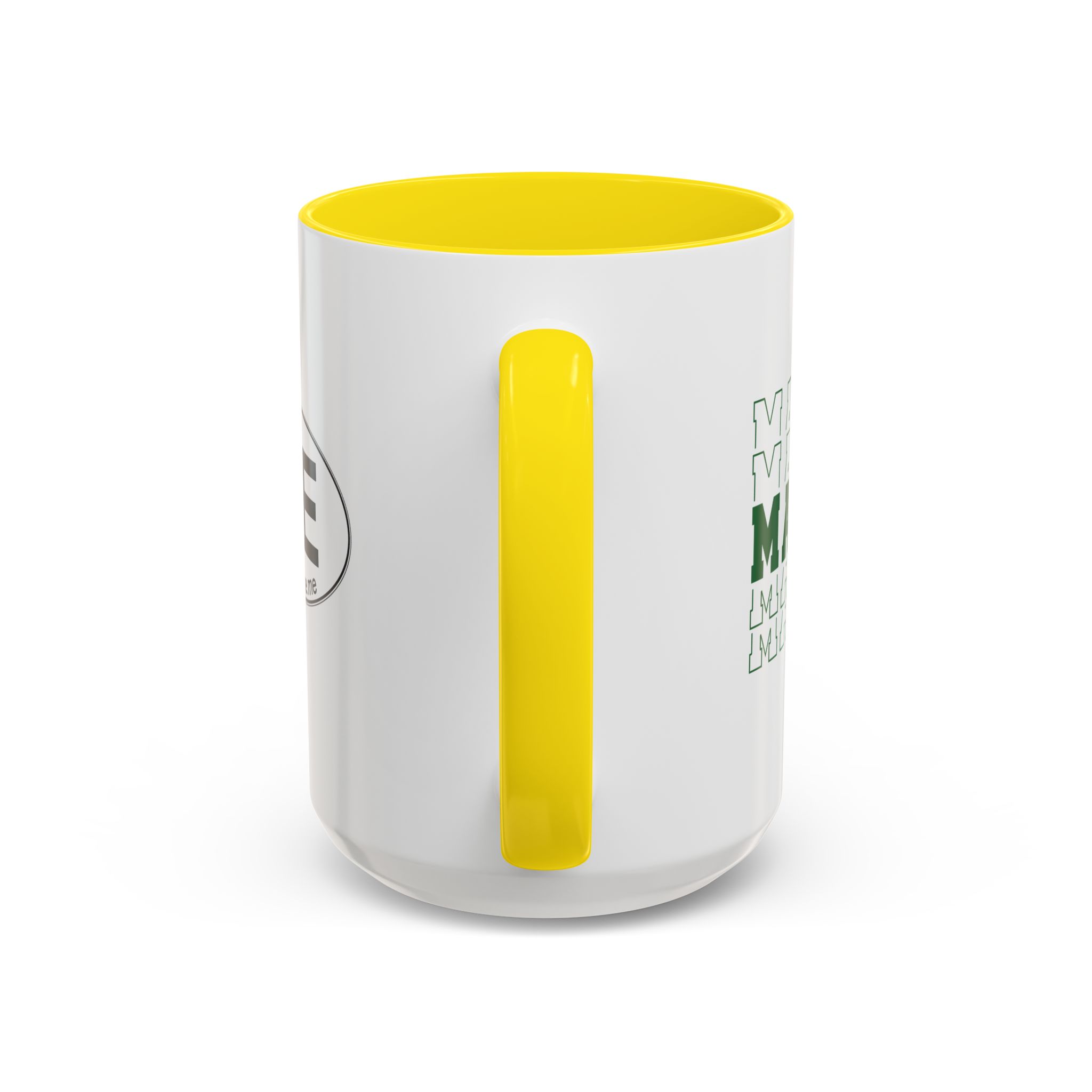 Stacked MAINE Green Words accented ceramic mug. This mug brings the perfect blend of style and functionality to elevate your coffee or tea ritual. Available in two generous sizes, 11oz (0.33 l) and 15oz (0.44 l), this mug offers ample space for your favorite brew. Made with white ceramic and sporting a sleek glossy finish with eye-catching contrast, this mug is a bliss both to use and to look at. The ergonomic C-shaped handle provides a comfortable grip, while the lead and BPA-free construction guarantee peace of mind with every sip.